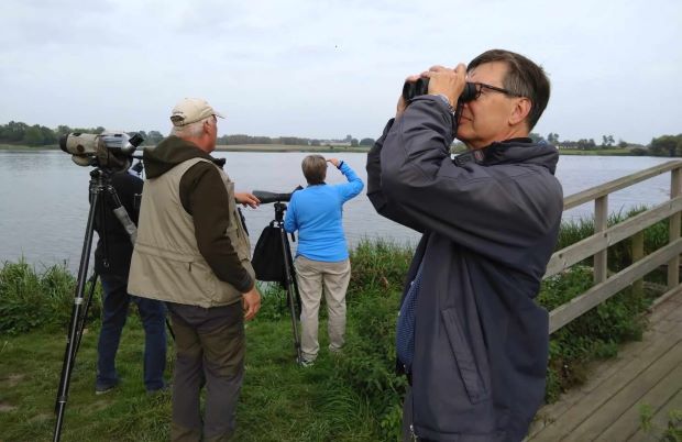Naturskyddsföreningens fågelgrupp träffas sent i september vid Näsbyholmssjön utanför Skurup. De sex deltagarna riggar tubkikare och hänger handkikare om halsen.
