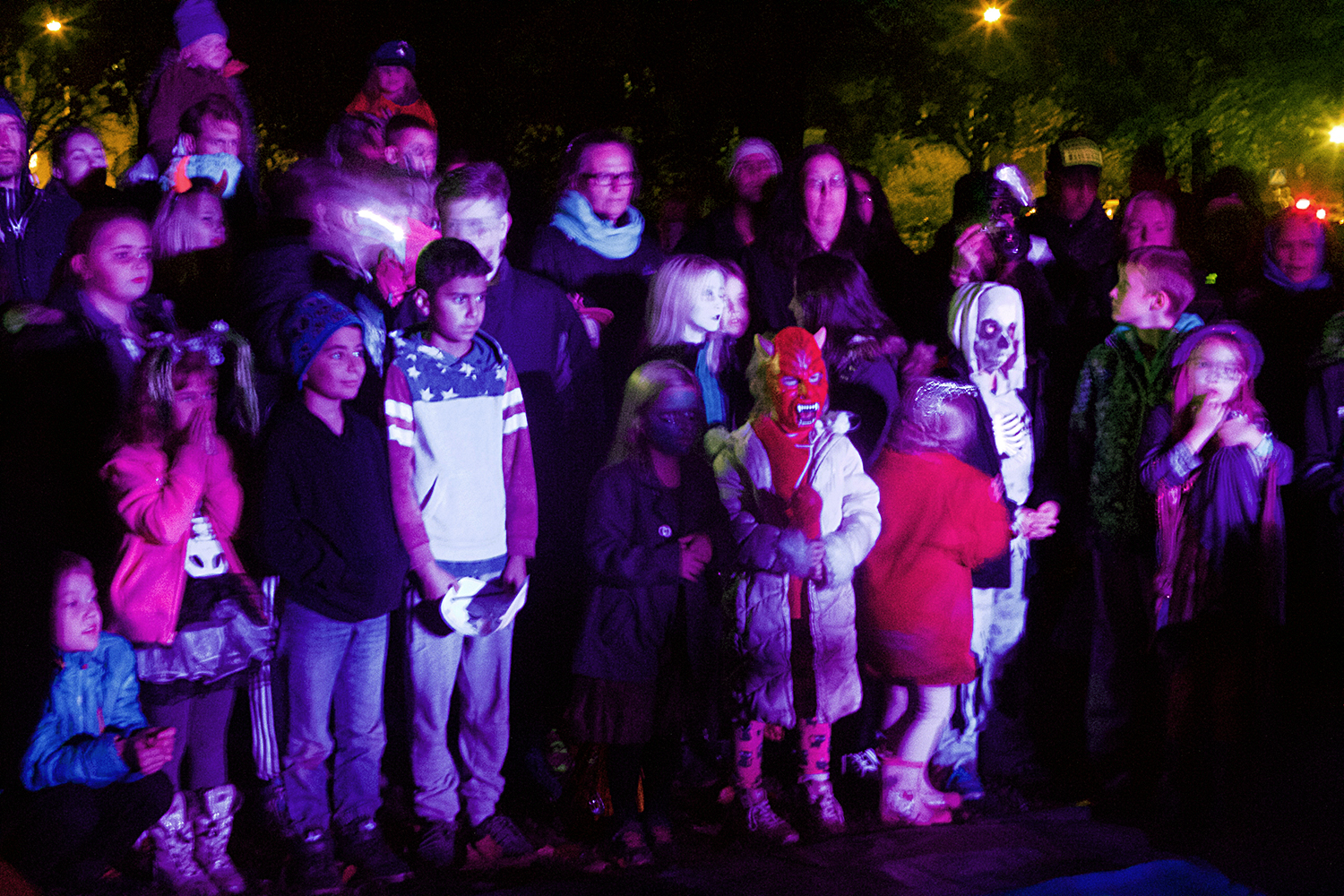 Alvin Moberg, 4 år, var utklädd till djävul och var förväntansfull inför sin första spökparad. Men i stället för att gå den traditionella paraden fick han tillsammans med de andra barnen röra sig mellan olika framträdanden av kulturskolan på skolgården. Pernilla Larsson beklagade sig över den dåliga sikten.